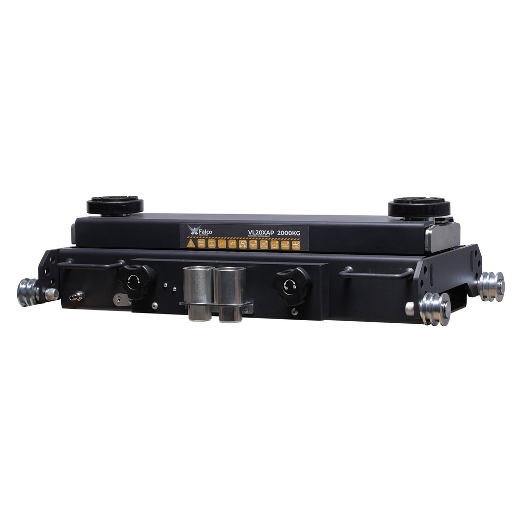 This air operated hydraulic jacking beam from Falco Sollevatori is a great addition for any four column & scissor lift installed in car workshops used for conducting maintenance.The jack can be easily installed and positioned thanks to the special ball bearing steel rollers, which have a universal adjustable position.The Falco jacking beam has an integrated two-stage pump, this system provides an automatic fast lifting stroke without weight and a slow controllable stroke when the jacking beam is lifting the vehicle.